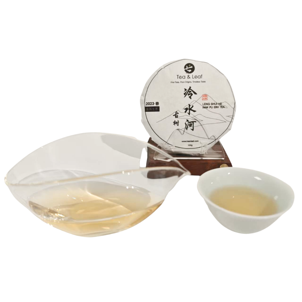 Tea & Leaf 2023 Spring Leng Shui He Ancient Tree Raw Pu-erh Tea 100g – Yiwu Guafengzhai Cold-Water River Sheng Pu-erh with honey aroma and refreshing sweet taste, served in glass pitcher and porcelain cup.