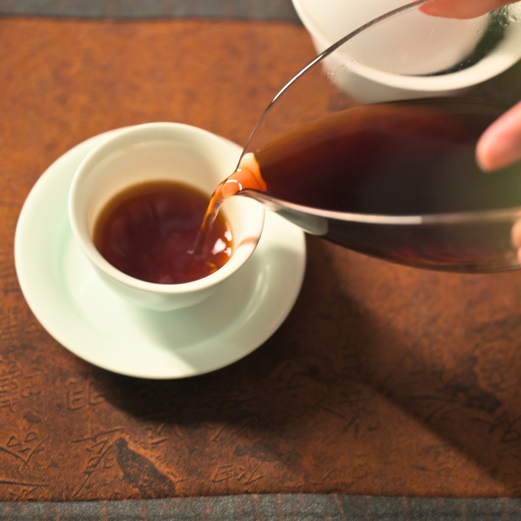 Pouring Tea & Leaf Runye 2023 Yiwu Ancient Tree Ripe Pu-erh Tea into a white porcelain teacup, showcasing deep amber color and smooth liquor from aged forest and rice aroma Yunnan Pu-erh tea.