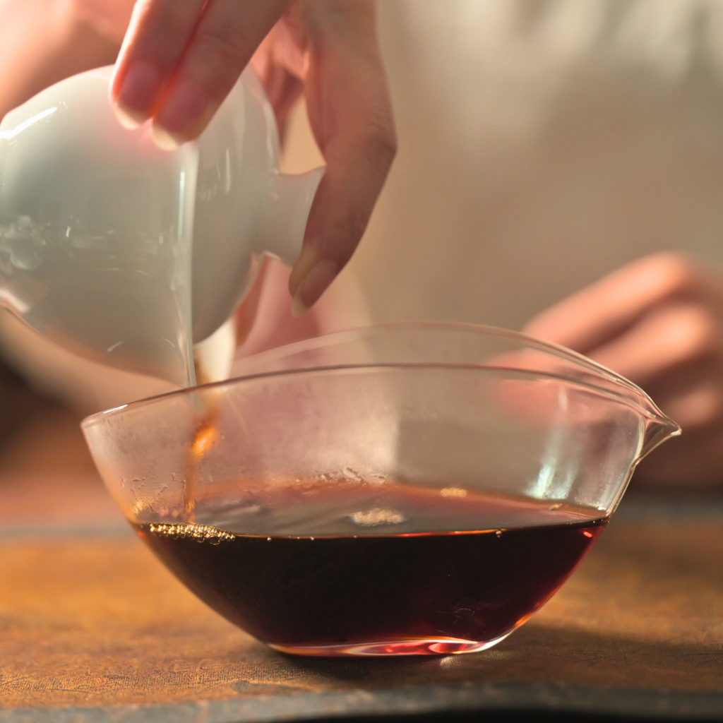 Pouring brewed Tea & Leaf Runye 2023 Yiwu Ancient Tree Ripe Pu-erh Tea from a white gaiwan into a glass fairness pitcher, showing deep amber liquor and smooth texture from aged forest and rice aroma Pu-erh tea.