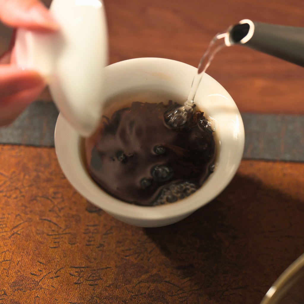 Brewing Tea & Leaf Runye 2023 Yiwu Ancient Tree Ripe Pu-erh Tea in a white porcelain gaiwan – hot water poured over dark fermented tea leaves, releasing rich forest and rice aroma from Yunnan, China.