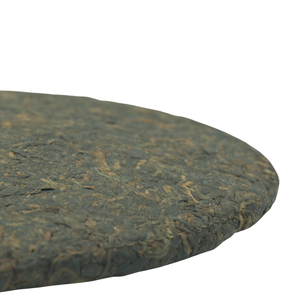 Close-up side view of Tea & Leaf Runye 2023 Yiwu Ancient Tree Ripe Pu-erh Tea Cake 357 g, showing tightly compressed aged tea leaves with natural golden tips and rich earthy texture from Yunnan, China.