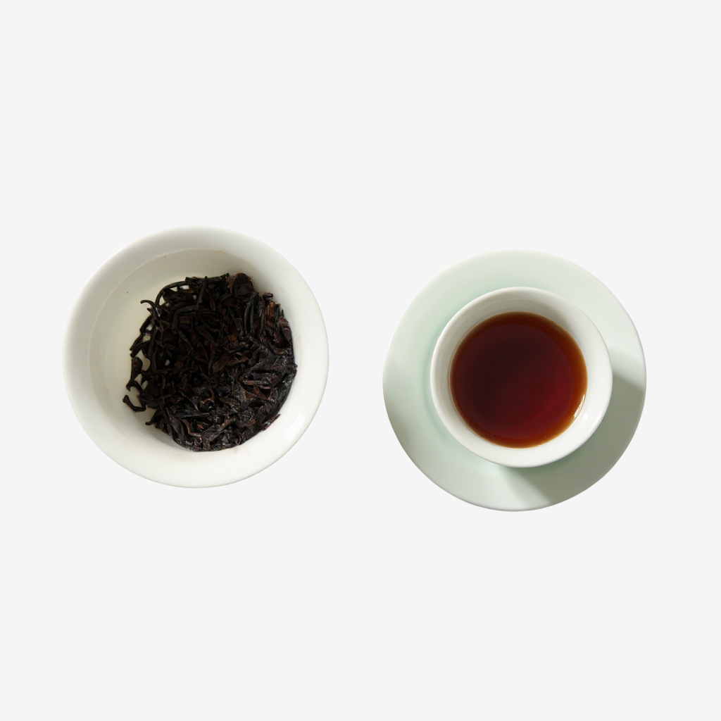 Tea & Leaf Runye 2023 Yiwu Ancient Tree Ripe Pu-erh Tea – close-up of brewed tea leaves and amber liquor in white porcelain gaiwan and teacup, showcasing aged forest and rice aroma from Yunnan, China.