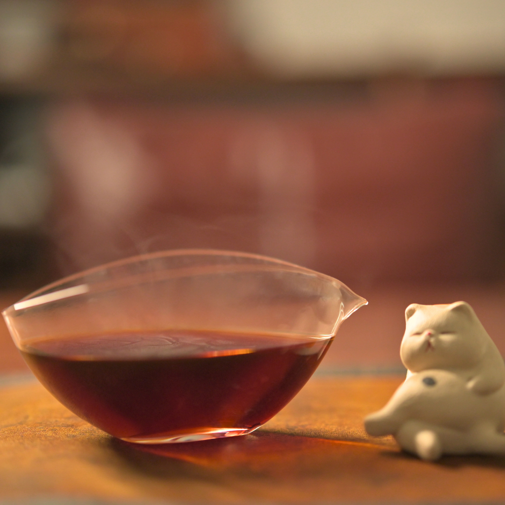 Steaming glass pitcher of Tea & Leaf Runye 2023 Yiwu Ancient Tree Ripe Pu-erh Tea with deep amber liquor, paired with a white ceramic tea pet, highlighting the rich forest and rice aroma of aged Yunnan Pu-erh.