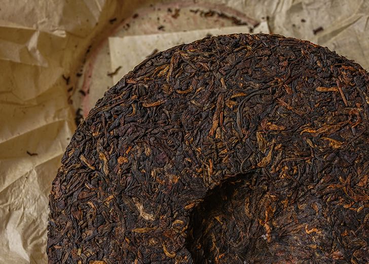 Close-up of vintage 1995 private customized 8582 recipe Bulang Ancient Tree raw Pu-erh tea cake — aged Sheng Pu-erh highlighting dark fermented leaves, golden buds, and tight compression from natural dry storage – Tea & Leaf.